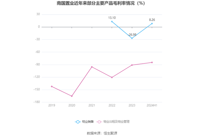 分产品看,物业销售、物业出租及物业管理2024年上半年毛利率分别为8.26%、-84.78%。