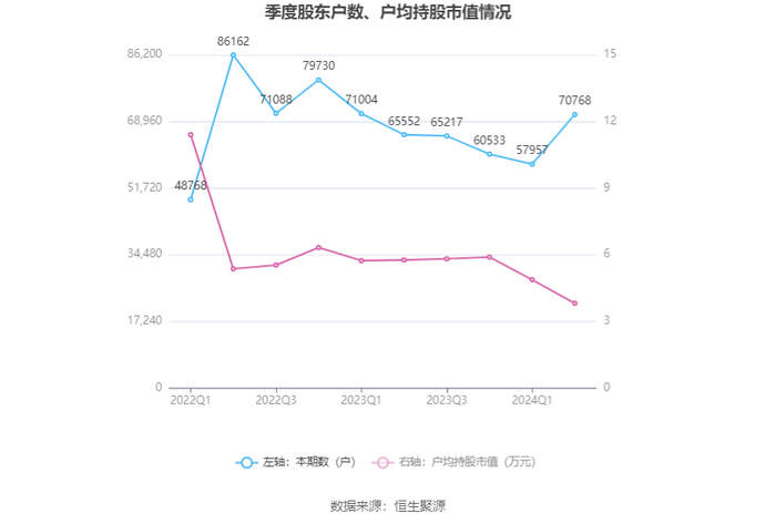 筹码集中度方面,截至2024年上半年末,公司股东总户数为7.08万户,较一季度末增长了1.28万户,增幅22.10%;户均持股市值由一季度末的4.88万元下降至3.82万元,降幅为21.72%。