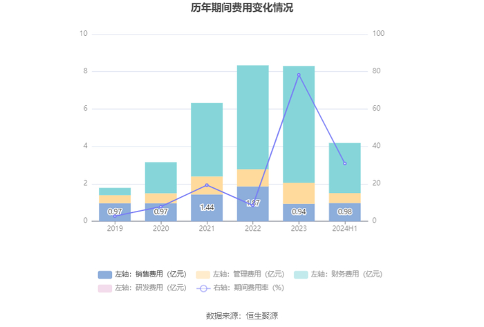 2024年上半年,公司期间费用为4.19亿元,较上年同期减少3023.02万元;期间费用率为30.93%,较上年同期下降70.36个百分点。其中,销售费用同比增长72.73%,管理费用同比增长3.65%,财务费用同比下降21.5%。