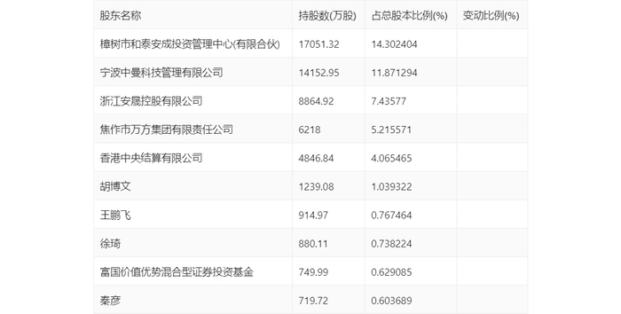 半年报显示,2024年上半年末的公司十大流通股东中,新进股东为徐琦、富国价值优势混合型证券投资基金、秦彦,取代了一季度末的和泰人寿保险股份有限公司-传统保险产品、宁波梅山保税港区长乐品潮投资管理合伙企业(有限合伙)、宁波梅山保税港区玉出昆冈投资管理合伙企业(有限合伙)。在具体持股比例上,浙江安晟控股有限公司、香港中央结算有限公司、胡博文、王鹏飞持股有所上升,樟树市和泰安成投资管理中心(有限合伙)持股有所下降。