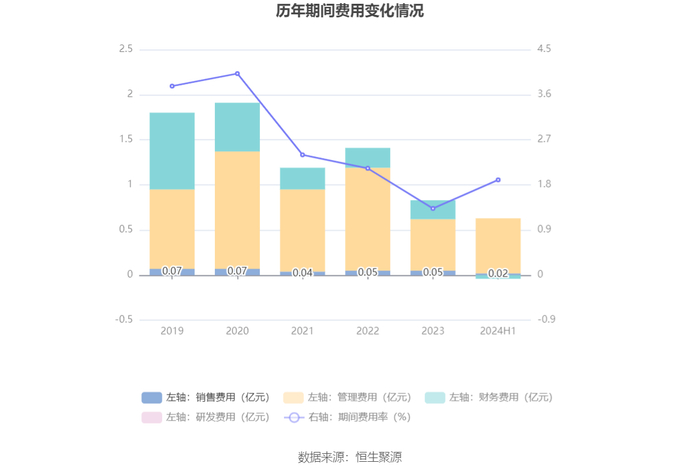 2024年上半年,公司期间费用为5960.97万元,较上年同期增加1287.60万元;期间费用率为1.90%,较上年同期上升0.38个百分点。其中,销售费用同比下降48.78%,管理费用同比增长132.46%,研发费用为33.34万元,财务费用由去年同期的1710.51万元变为-354.10万元。