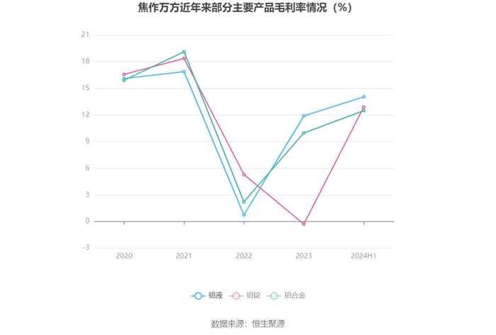 分产品看,铝液、铝锭、铝合金2024年上半年毛利率分别为14.04%、12.89%、12.49%。