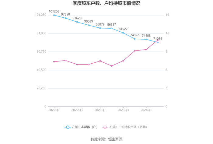 筹码集中度方面,截至2024年上半年末,公司股东总户数为7.11万户,较一季度末下降了3349户,降幅4.50%;户均持股市值由一季度末的9.37万元上升至10.91万元,增幅为16.44%。