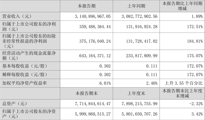 数据显示,2024年上半年公司加权平均净资产收益率为6.01%,较上年同期增长3.55个百分点;公司2024年上半年投入资本回报率为5.21%,较上年同期增长3.05个百分点。