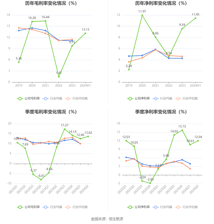 2024年上半年,公司毛利率为13.13%,同比上升9.41个百分点;净利率为11.45%,较上年同期上升7.17个百分点。从单季度指标来看,2024年第二季度公司毛利率为13.62%,同比上升5.26个百分点,环比上升1.16个百分点;净利率为12.04%,较上年同期上升6.56个百分点,较上一季度上升1.41个百分点。