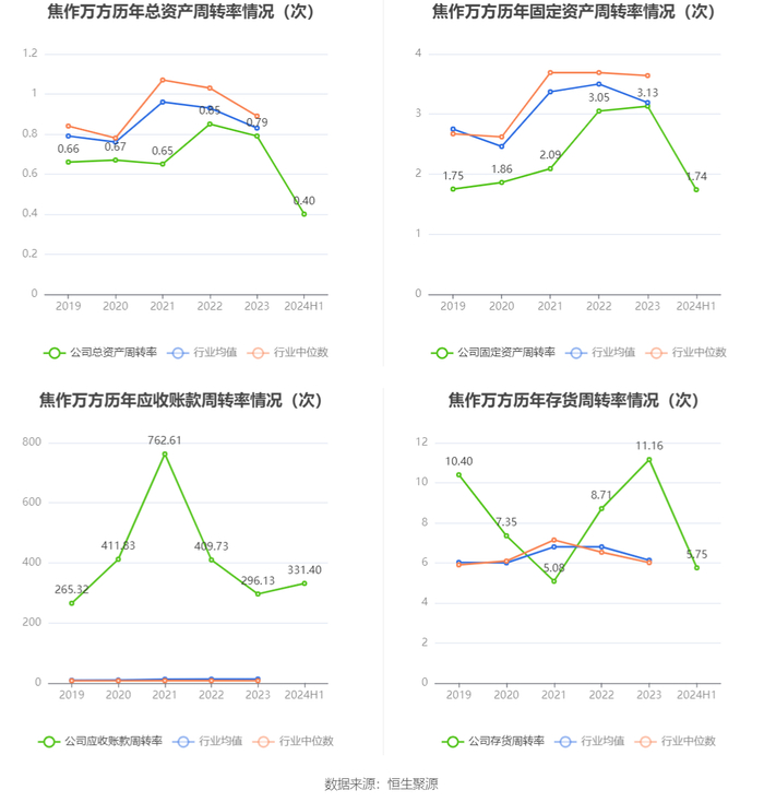 营运能力方面,2024年上半年,公司总资产周转率为0.40次,上年同期为0.39次(2023年上半年行业平均值为0.40次,公司位居同行业17/30);固定资产周转率为1.74次,上年同期为1.47次(2023年上半年行业平均值为1.56次,公司位居同行业19/30);公司应收账款周转率、存货周转率分别为331.40次、5.75次。
