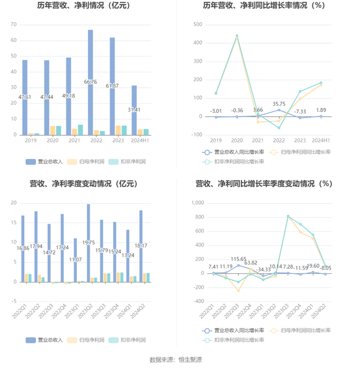 根据半年报,公司第二季度实现营业总收入18.17亿元,同比下降8.05%,环比增长37.16%;归母净利润2.19亿元,同比增长101.88%,环比增长55.32%;扣非净利润2.28亿元,同比增长108.63%,环比增长54.21%。