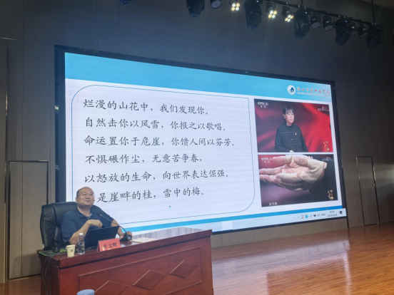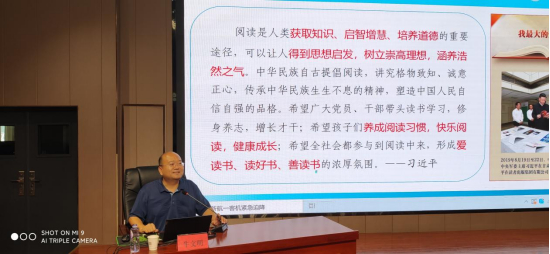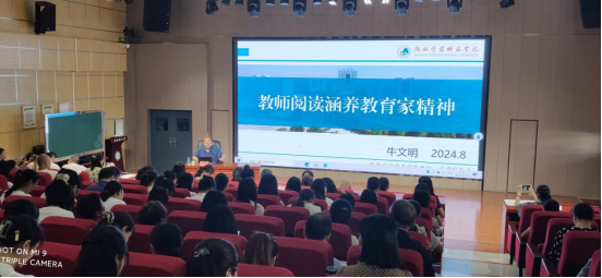 牛文明教授作了主题为《教师阅读涵养教育家精神》专题讲座。他首先通过丰富的案例、生动的视频、幽默的漫画,向大家展示了当代教育面临的挑战与机遇,使老师们进一步明确了教师阅读的重要意义。接着,他从从明晰任务、回应时代、厚植情怀、三个推荐书目四个层面进行讲解,为教师专业阅读指明了路径和方法。