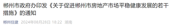 8月28日,据“郴州住建”公众号消息,湖南省郴州市政府办印发《关于促进郴州市房地产市场平稳健康发展的若干措施》的通知。
