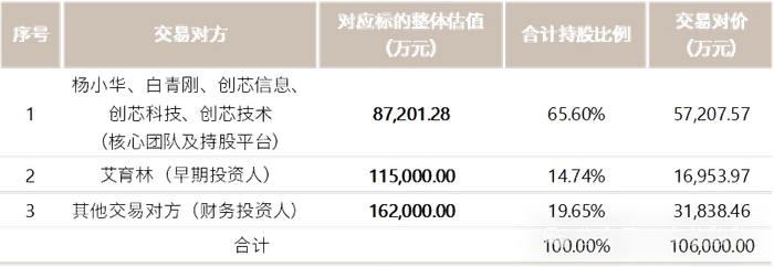 根据思瑞浦披露公告,参考评估估值,初步确定创芯微100%股权交易作价不超过106,624.04万元(创芯微100%股权评估价值)的前提。在此前提下,考虑到创芯微最后一轮估值已达13.1亿元、增资协议中约定了8%回购利率及创始团队的连带责任,最终确定财务投资人部分股权对应整体估值为16.2亿元,艾育林所持部分股权对应整体估值最终确定为11.5亿元。艾育林、财务投资人的差异化作价和评估值间差距则由创芯微管理团队让渡,具体如下: