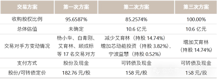 思瑞浦收购创芯微的重组方案最早披露于2023年6月,后续方案历经两次调整,最终确定为以发行可转债及现金方式收购创芯微合计100%股权,标的整体估值为10.6亿元,其中核心团队及员工持股平台获得的对价中18,868.62万元以现金方式支付,剩余38,338.95万元以可转换公司债券的方式支付,其余交易对方均以现金对价支付,交易方案具体变化如下: