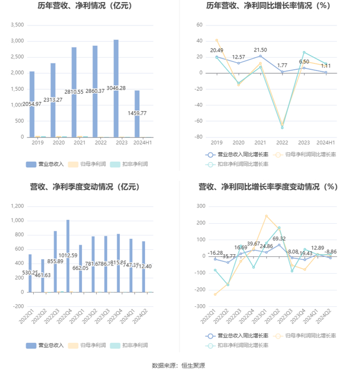 根据半年报,公司第二季度实现营业总收入712.4亿元,同比下降8.86%,环比下降4.68%;归母净利润5.36亿元,同比增长7.26%,环比增长84.62%;扣非净利润5.53亿元,同比增长12.09%,环比增长268.50%。