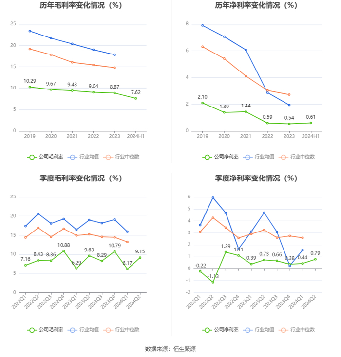 2024年上半年,公司毛利率为7.62%,同比下降0.48个百分点;净利率为0.61%,较上年同期上升0.04个百分点。从单季度指标来看,2024年第二季度公司毛利率为9.15%,同比下降0.48个百分点,环比上升2.98个百分点;净利率为0.79%,较上年同期上升0.06个百分点,较上一季度上升0.35个百分点。