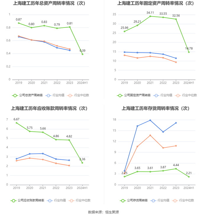 营运能力方面,2024年上半年,公司总资产周转率为0.39次,上年同期为0.40次(2023年上半年行业平均值为0.21次,公司位居同行业22/167);固定资产周转率为14.78次,上年同期为16.65次(2023年上半年行业平均值为5.55次,公司位居同行业28/167);公司应收账款周转率、存货周转率分别为2.36次、2.21次。