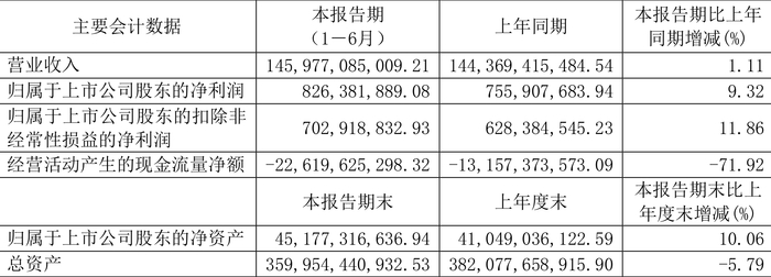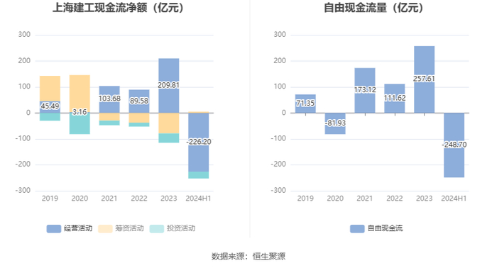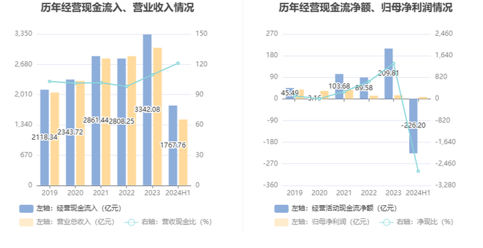 2024年上半年,公司经营活动现金流净额为-226.20亿元,同比减少94.62亿元;筹资活动现金流净额4.82亿元,同比增加25.11亿元;投资活动现金流净额-26.42亿元,上年同期为-35.92亿元。