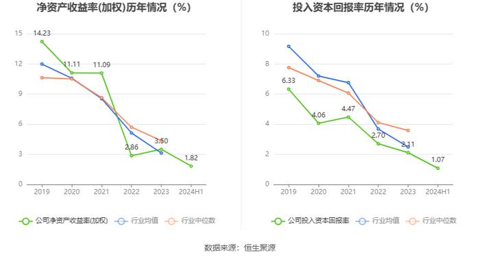 数据显示,2024年上半年公司加权平均净资产收益率为1.82%,较上年同期下降0.24个百分点;公司2024年上半年投入资本回报率为1.07%,较上年同期下降0.01个百分点。