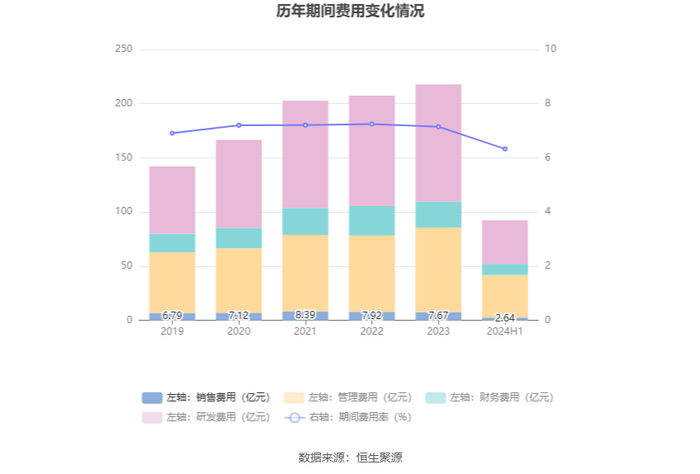 2024年上半年,公司期间费用为92.38亿元,较上年同期减少5.03亿元;期间费用率为6.33%,较上年同期下降0.42个百分点。其中,销售费用同比下降22.56%,管理费用同比增长2.19%,研发费用同比下降8.68%,财务费用同比下降11.1%。