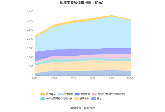 负债重大变化方面,截至2024年上半年末,公司应付账款较上年末减少12.17%,占公司总资产比重下降3.05个百分点;合同负债较上年末减少8.21%,占公司总资产比重下降0.24个百分点;应付债券较上年末减少30.35%,占公司总资产比重下降0.65个百分点,主要系本期境外债券重分类至一年内到期的非流动负债;一年内到期的非流动负债较上年末增加25.44%,占公司总资产比重上升0.97个百分点。