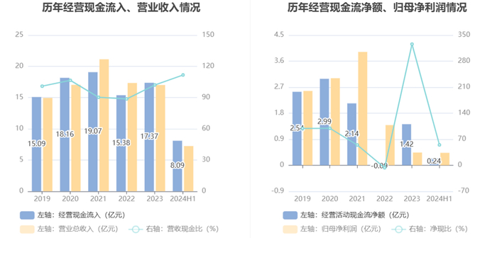 2024年上半年,公司营业收入现金比为111.72%,净现比为54.75%。