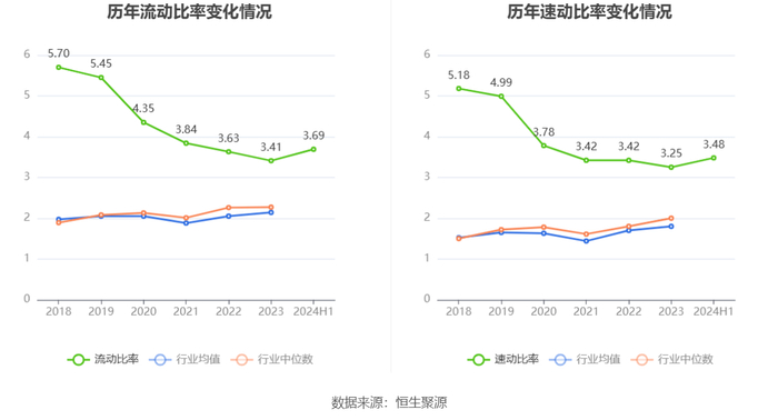 2024年上半年,公司流动比率为3.69,速动比率为3.48。