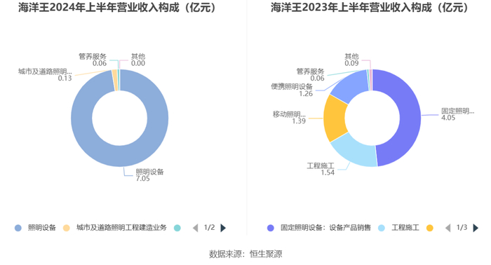 分产品来看,2024年上半年公司主营业务中,照明设备收入7.05亿元,同比增长3.94%,占营业收入的97.27%;城市及道路照明工程建造业务收入0.13亿元,同比下降91.85%,占营业收入的1.73%;管养服务收入0.06亿元,同比下降4.18%,占营业收入的0.85%。