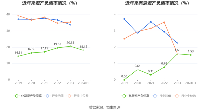 在偿债能力方面,公司2024年上半年末资产负债率为18.12%,相比上年末下降2.51个百分点;有息资产负债率为1.53%,相比上年末下降0.07个百分点。