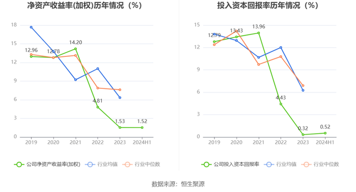 数据显示,2024年上半年公司加权平均净资产收益率为1.52%,较上年同期下降1.27个百分点;公司2024年上半年投入资本回报率为0.52%,较上年同期下降2.20个百分点。