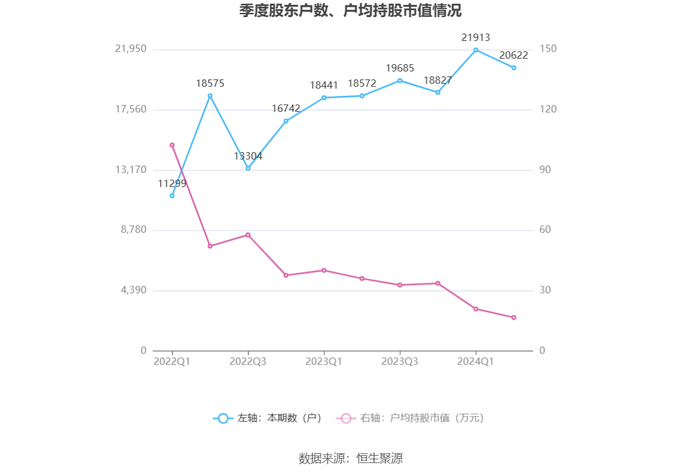 筹码集中度方面,截至2024年上半年末,公司股东总户数为2.06万户,较一季度末下降了1291户,降幅5.89%;户均持股市值由一季度末的20.91万元下降至16.65万元,降幅为20.37%。