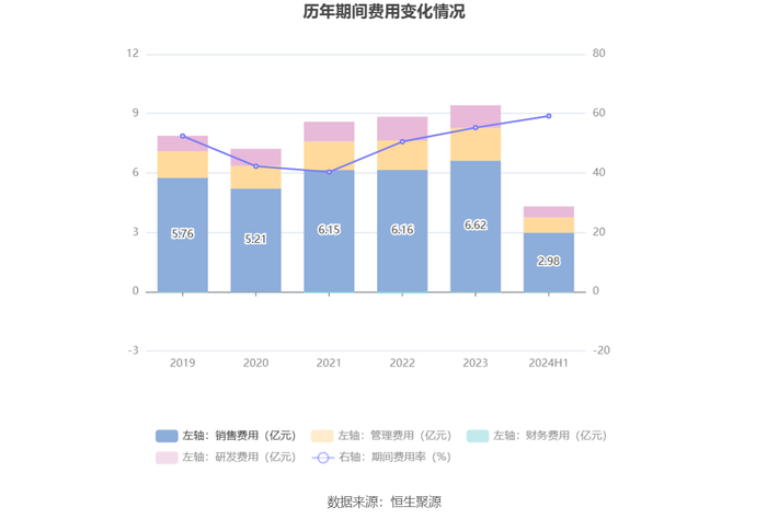 2024年上半年,公司期间费用为4.29亿元,较上年同期增加2515.61万元;期间费用率为59.20%,较上年同期上升11.11个百分点。其中,销售费用同比增长6.77%,管理费用同比增长7.18%,研发费用同比增长3.1%,财务费用由去年同期的-195.44万元变为-259.28万元。