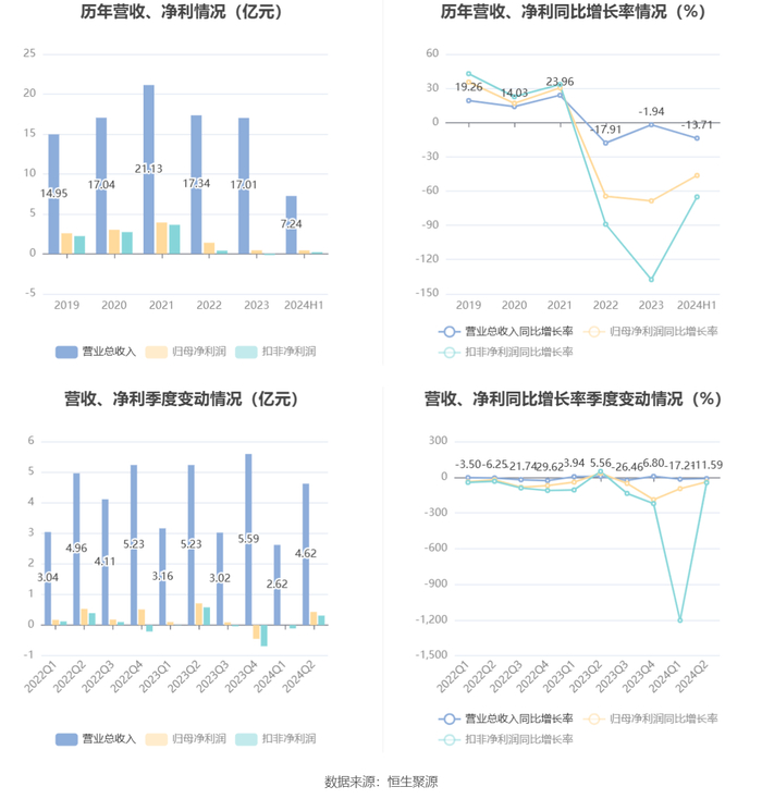 根据半年报,公司第二季度实现营业总收入4.62亿元,同比下降11.59%,环比增长76.57%;归母净利润4283.1万元,同比下降39.40%,环比增长12637.05%;扣非净利润3136.71万元,同比下降46.33%,环比增长377.84%。
