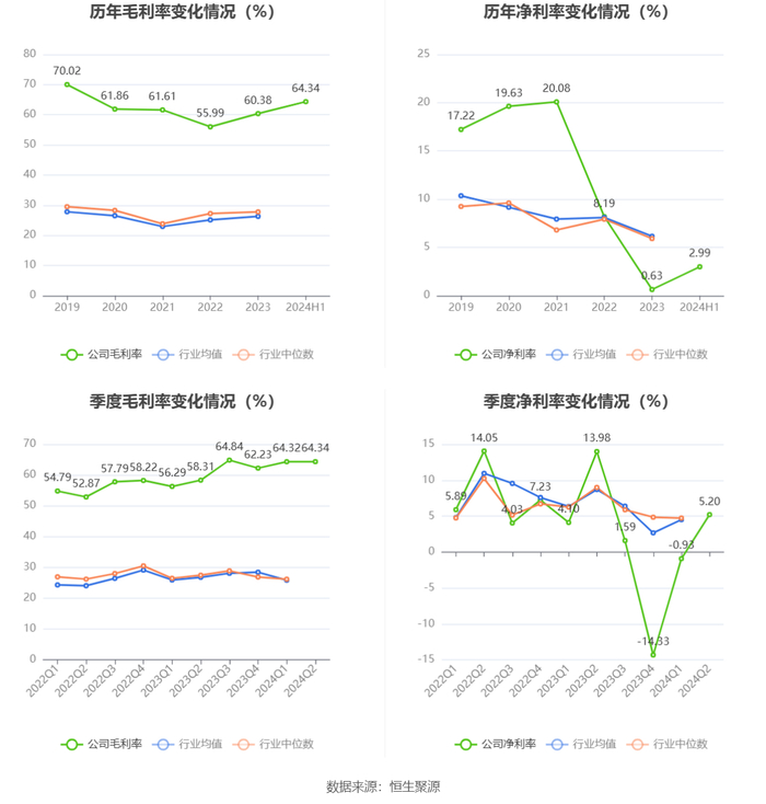 2024年上半年,公司毛利率为64.34%,同比上升6.79个百分点;净利率为2.99%,较上年同期下降7.26个百分点。从单季度指标来看,2024年第二季度公司毛利率为64.34%,同比上升6.03个百分点,环比上升0.02个百分点;净利率为5.20%,较上年同期下降8.78个百分点,较上一季度上升6.13个百分点。