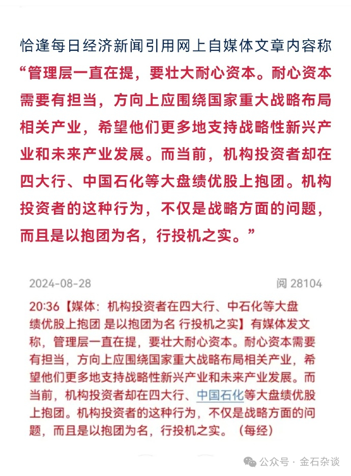 金石杂谈简单分析如下:1)核心是涨的太高,稍有利空部分获利资金就会选择砸盘跑路。8月28日晚间,每经的一篇锤四大行抱团的文章刷屏,核心就是:机构投资者在四大行、中国石化等大盘绩优股上抱团的行为,不仅是战略方面的问题,而且是以抱团为名,行投机之实。