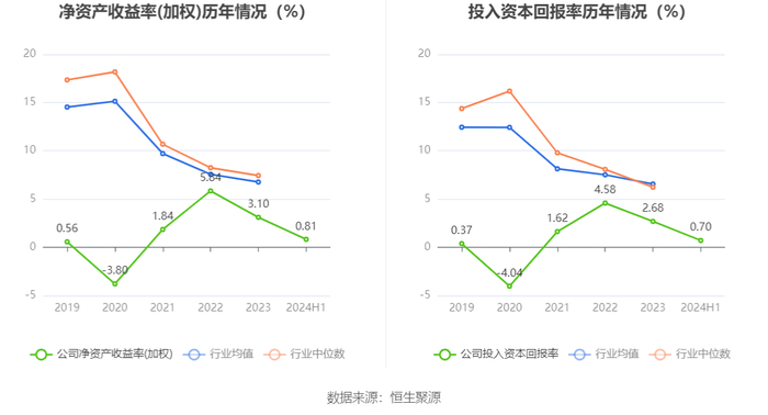 数据显示,2024年上半年公司加权平均净资产收益率为0.81%,较上年同期下降2.04个百分点;公司2024年上半年投入资本回报率为0.70%,较上年同期下降1.49个百分点。