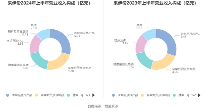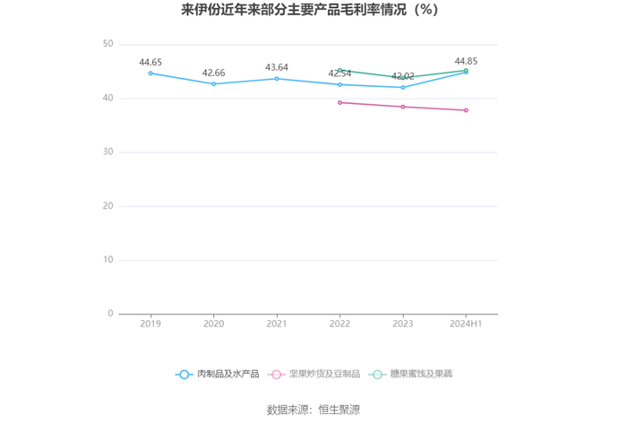 分产品看,肉制品及水产品、坚果炒货及豆制品、糖果蜜饯及果蔬2024年上半年毛利率分别为44.85%、37.79%、45.18%。