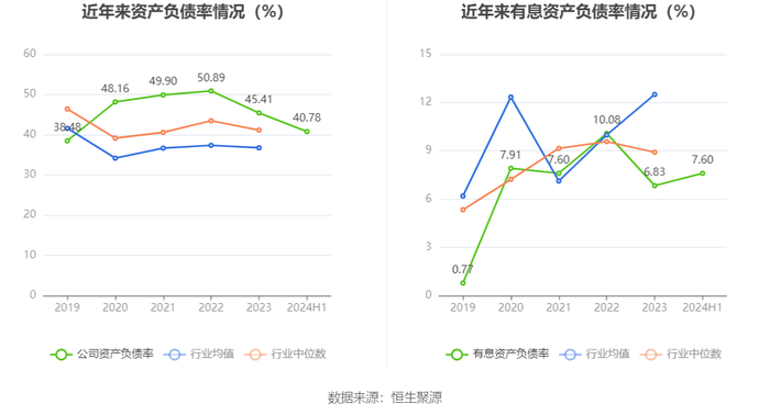 在偿债能力方面,公司2024年上半年末资产负债率为40.78%,相比上年末下降4.63个百分点;有息资产负债率为7.60%,相比上年末上升0.77个百分点。