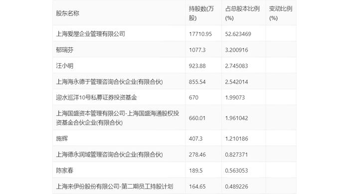 半年报显示,2024年上半年末公司十大流通股东中,新进股东为上海来伊份股份有限公司-第二期员工持股计划,取代了一季度末的上海来伊份股份有限公司回购专用证券账户。在具体持股比例上,上海爱屋企业管理有限公司、汪小明持股有所上升。