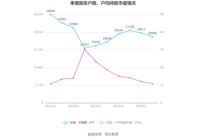 筹码集中度方面,截至2024年上半年末,公司股东总户数为2.9万户,较一季度末下降了1645户,降幅5.37%;户均持股市值由一季度末的12.14万元下降至10.89万元,降幅为10.30%。