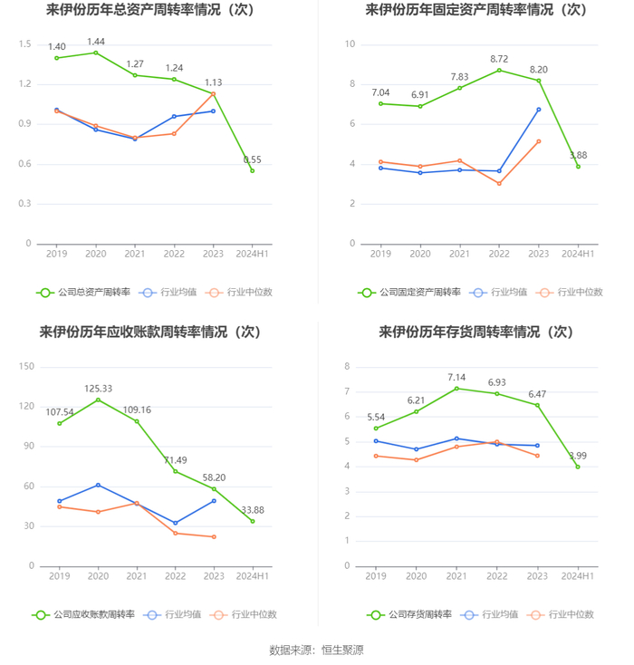 营运能力方面,2024年上半年,公司总资产周转率为0.55次,上年同期为0.60次(2023年上半年行业平均值为0.49次,公司位居同行业6/11);固定资产周转率为3.88次,上年同期为4.38次(2023年上半年行业平均值为2.10次,公司位居同行业3/11);公司应收账款周转率、存货周转率分别为33.88次、3.99次。