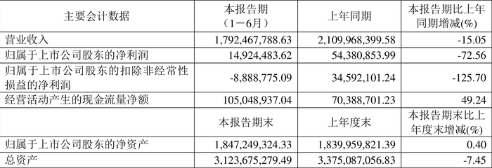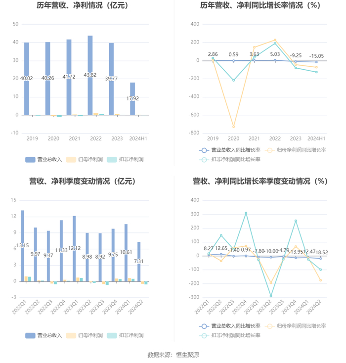 根据半年报,公司第二季度实现营业总收入7.31亿元,同比下降18.52%,环比下降31.10%;归母净利润-4638.73万元,同比下降175.58%,环比下降175.66%;扣非净利润-5607.16万元,同比下降98.55%,环比下降218.84%。