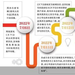 据公开资料,2022年7月,周杰伦时隔六年发布新专辑《最伟大的作品》,同月《天下3》在官方微博举办“转抽送100张周杰伦新专辑”活动。随后,杰威尔音乐官方微博发布声明指出,“从未授权该款游戏使用周杰伦之音乐作品,亦无授权其赠送周杰伦演唱会门票,该公司活动与杰威尔音乐无关,亦与周杰伦无关,并非官方授权的活动,相关法律问题,本公司已委由律师依法处理”。