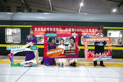 8月26日21时50分,随着风笛鸣响,K4696次旅客列车准时从呼和浩特东站驶出,开往赤峰南站。列车首发,3名身着蒙古袍的列车员手举引导牌,吸引许多旅客驻足合影、打卡留念。