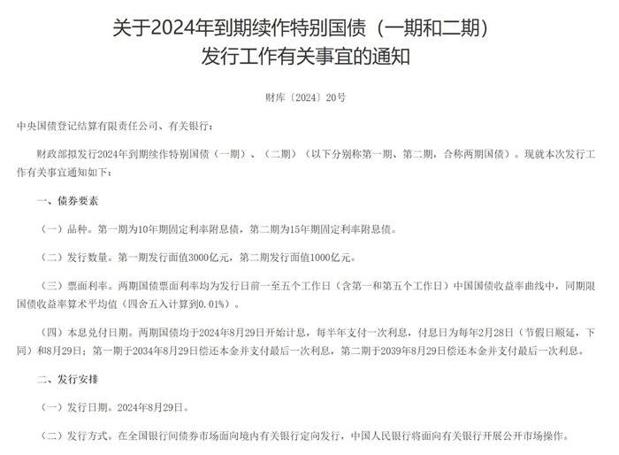 8月19日,财政部发布关于2024年到期续作特别国债发行工作有关事宜的通知。财政部拟发行2024年到期续作特别国债(一期)、(二期)。第一期为10年期固定利率附息债,第二期为15年期固定利率附息债。第一期发行面值3000亿元,第二期发行面值1000亿元。两期国债票面利率均为发行日前一至五个工作日(含第一和第五个工作日)中国国债收益率曲线中,同期限国债收益率算术平均值(四舍五入计算到0.01%)。发行日期为2024年8月29日,在全国银行债券市场面向境内有关银行定向发行,中国人民银行将面向有关银行开展公开市场操作。