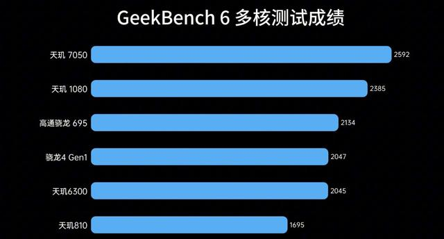 在反应CPU性能的GeekBench 6测试中,天玑6300单核得分为795分,多核为2045分,未能超越骁龙695,自然也无法媲美定位更高的天玑7050。