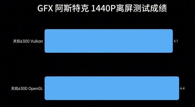 我们还简单跑了一下GFX 阿斯特克 1440P离屏测试,vulkan模式下成绩为6.1帧,openGL模式下成绩为6.4帧,相比大哥天玑7050差距明显。