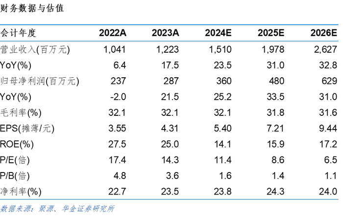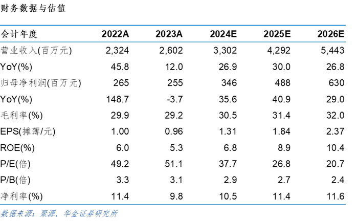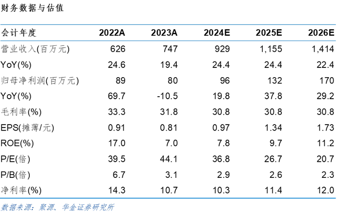 单季度看,24Q2公司营收、归母净利润和扣非归母净利润均创历史新高。24Q2公司实现营收2.41亿元,同比增长42.60%,环比增长19.18%;归母净利润0.66亿元,同比增长48.49%,环比增长27.36%;扣非归母净利润0.60亿元,同比增长53.12%,环比增长32.02%;毛利率42.79%,同比提升3.30个百分点,环比提升2.08个百分点。