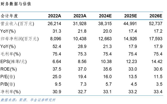 公司发布24年中报:上半年公司实现营收227.46亿,同比+19.65%,归母净利润84.10亿元,同比+24.27%,扣非归母84.09亿元,同比+24.41%,净利率36.97%(同比+1.38pct)。其中24Q2公司实现营收74.08亿元,同比+17.06%,毛利率75.09%(同比-2.7pct),税率19.69%(同比-0.44pct),归母净利润21.47亿元,同比+10.23%,扣非归母21.49亿元,同比+10.39%,净利率29%(同比-1.8pct)。