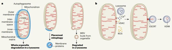 线粒体有内、外两层膜,先前的研究发现,线粒体受损后通常是通过外膜蛋白上的泛素化修饰或直接被有丝分裂受体识别,然后整个儿被自噬体吞噬,再被溶酶体降解,回收其中有用的分子。而新研究发现,线粒体还可以精确针对局部受损进行清除和修复,并且这种局部修复可以针对发生在内膜的部位。