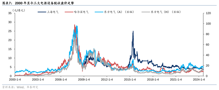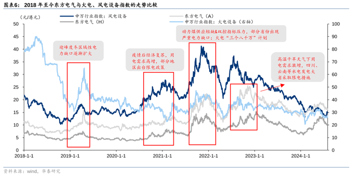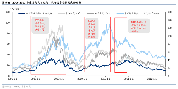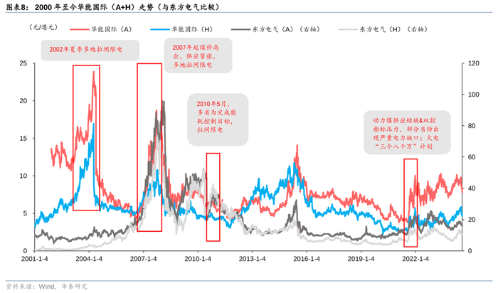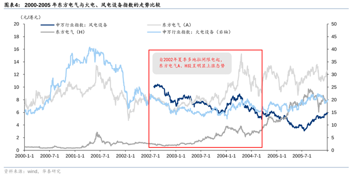 我们以东方电气为例,进行复盘,观察其历史股价走势与我国缺电事件的关系。由于复盘追溯的时间较长,为保障复盘图表具有较好的可读性,此处与前文保持一致,分别对2002-2004年、2007-2011年、2020-2022年进行复盘。我们发现:1)东方电气A股与H股走势相近,缺电事件对其股价走势均具有催化作用,2002/2007/2011/2019/2021/2022年等多次部分地区拉闸限电的新闻均伴随着公司股价的明显上涨,我们认为“缺电”事件对于电源设备股的走势具有一定催化作用;2)随着东方电气完善其业务架构,风电业务占比不断提升,公司整体走势早期与火电指数更为贴合,逐渐也向风电设备走势靠拢。