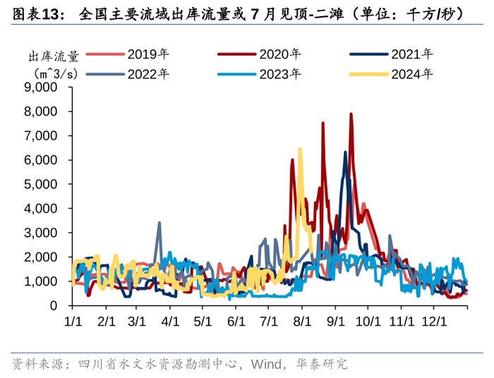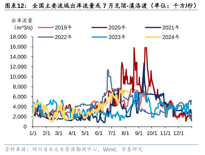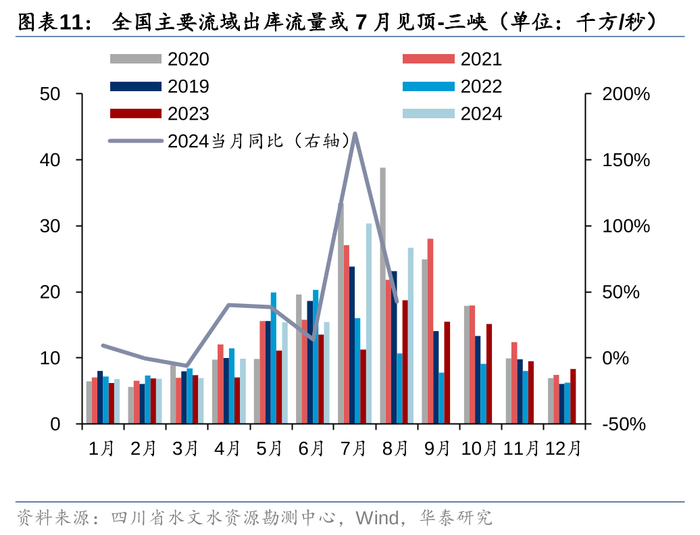 根据我们对全国主要流域来水的跟踪,水电利用小时同比增速大概率7月见顶,8月同比增速已经开始回落;并且目前的主要大水库蓄能与去年同期相差不大(去年较多流域秋汛期末水库接近蓄满),对今年冬天枯水期水电发力不会造成太大的提升作用。随着2023年8月开始水电利用小时恢复到相对正常的状态,我们认为水电对火电同比增速的挤压效应会逐步减弱。假设2024年7-12月全口径发电量增速维持1H24的水平,假设风电、光伏、核电的增速也与1H24一致;水电保守假设7月利用小时高于历史最高水平(2020年7月)5%,相当于高于历史均值18%(2024年6月高于历史均值6%),且8-12月利用小时也高于历史均值18%,火电的电量同比降幅在8-12月或将缩窄到5%以内。