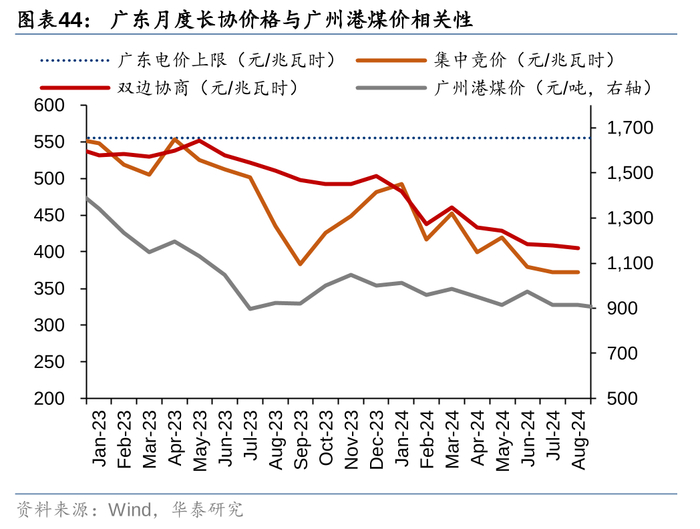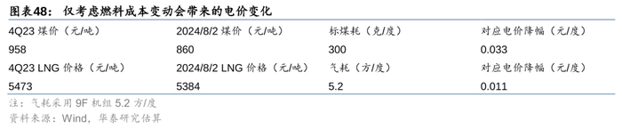 因为大部分省份的年底长协谈判都是从前一年的国庆前后持续到第二年初(一般为春节前),4Q23的燃料价格对2024年年度电价谈判影响最大。如果我们用秦皇现货煤价与广东LNG出厂价作为参照指标,暂不考虑其他决定电价的因素,目前的燃料价格可能会导致电价相对2023年底谈判出的2024年年度长协有1-3分/度的下降。如果年底前煤价相对当前的价格还有进一步上行的可能,我们认为2025年年度长协的电价降幅会明显小于我们的预测。